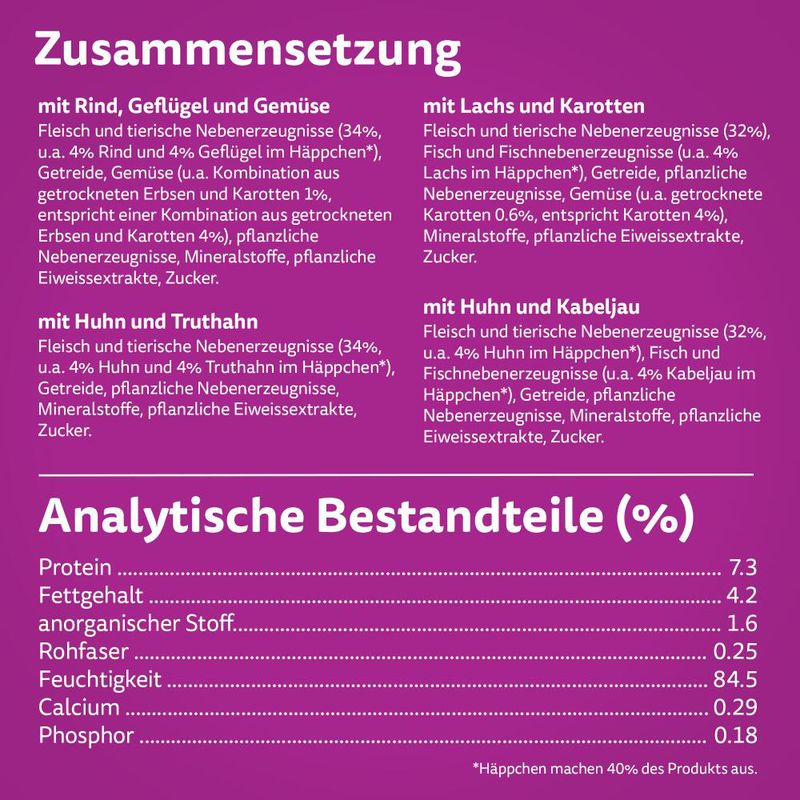 Fleisch und tierische Nebenerzeugnisse (34%, u.a. 4% Rind und 4% Geflügel im Häppchen*), Getreide, Gemüse (u.a. Kombination aus getrockneten Erbsen und Karotten 1%, entspricht einer Kombination aus getrockneten Erbsen und Karotten 4%), pflanzliche Nebenerzeugnisse, Mineralstoffe, pflanzliche Eiweissextrakte, Zucker.